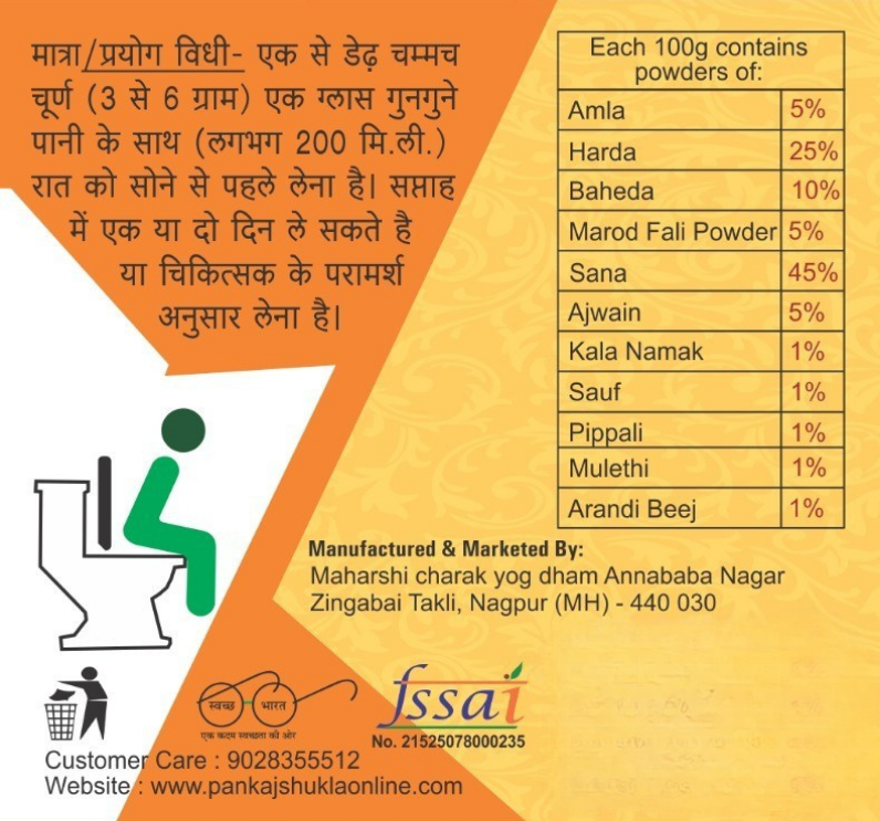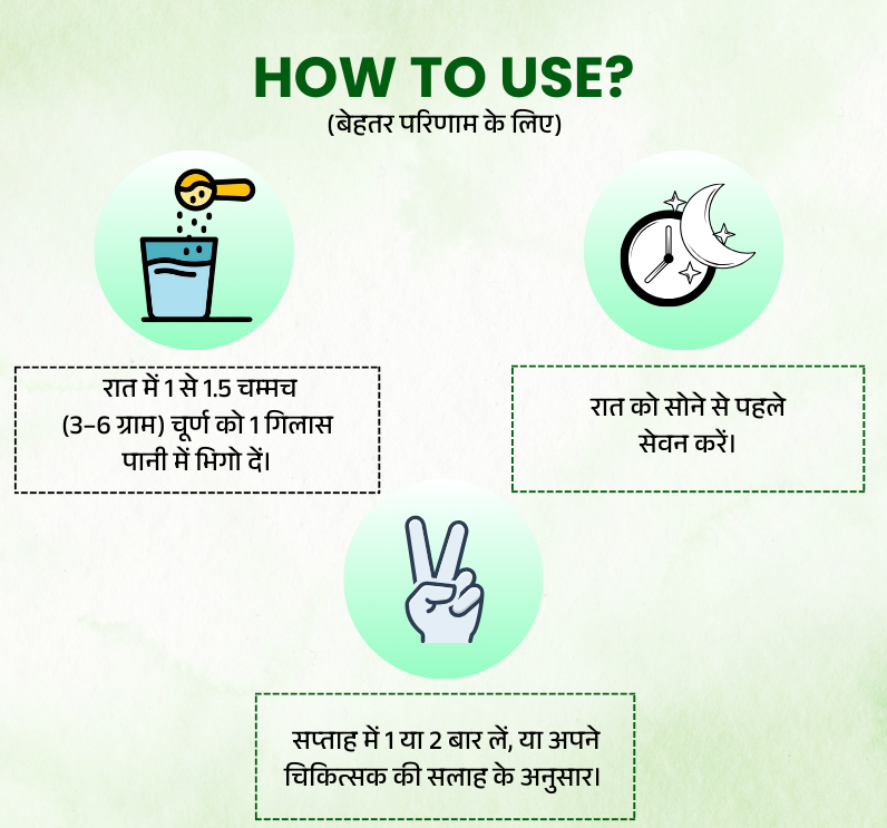 🌱 100% आयुर्वेदिक फार्मूला – सना, हरड़, बहेड़ा और आंवला जैसे प्राकृतिक जड़ी-बूटियों से निर्मित।