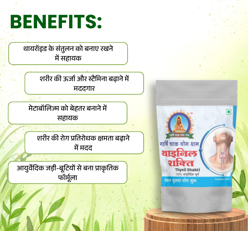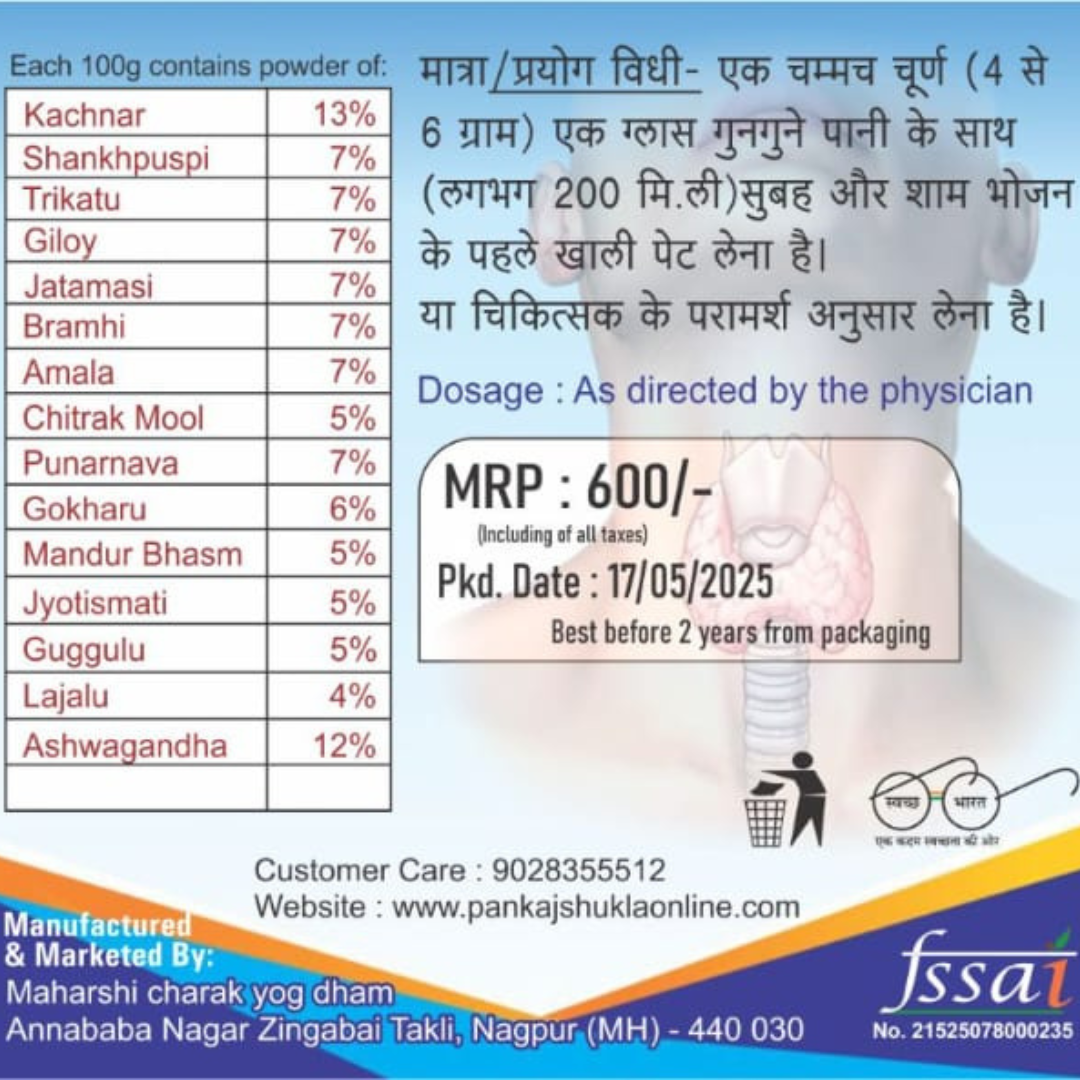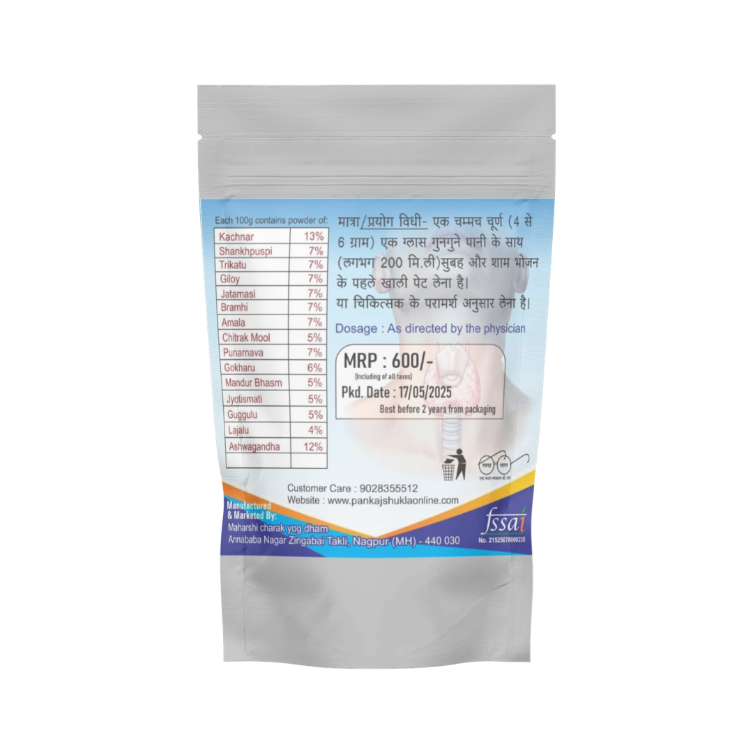 🌿 थायरॉइड सपोर्ट फॉर्मूला – यह चूर्ण थायरॉइड ग्रंथि के संतुलन को बनाए रखने में सहायक माना जाता है।